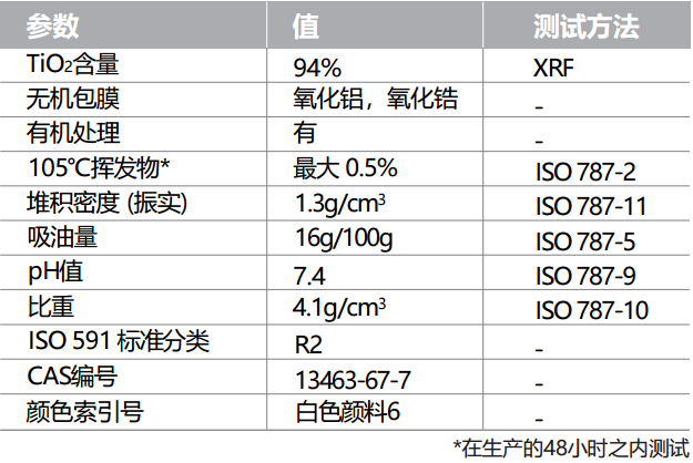 优异的白度和遮盖力、杰出的分散性能、较高的耐候性、高光泽度。