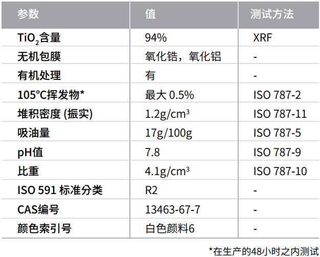 具有超高耐候性、高白度、高分散性以及高光泽度。