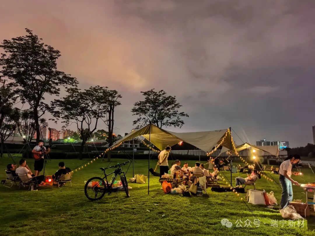 同事们迅速在营地上架起露营天幕、桌椅、烧烤炉,云淡风轻、船来船往,谈天论地,海阔天空。