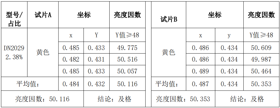 2、环保中黄DN2029颜料制成的热熔型马路标线涂料试片A、试片B的600小时人工加速老化耐候前后亮度因素数据符合JT/T 280-2022涂层亮度因数变化范围应不大于规定中亮度因数20%